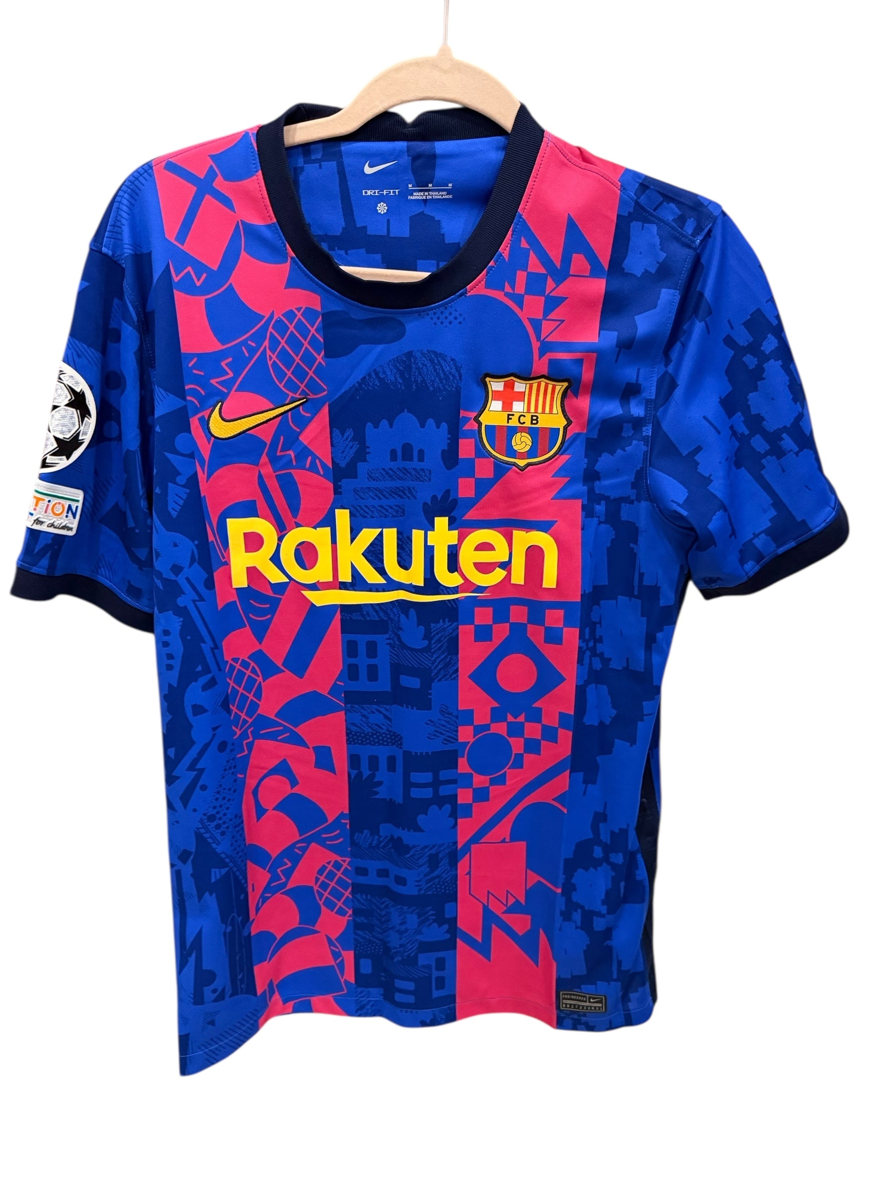 Preciosa camiseta del Barcelona con los parches de la Champions League. Un homenaje a los barrios de la ciudad condal.